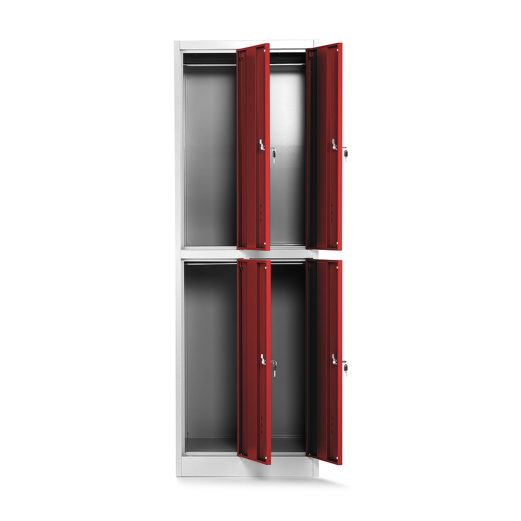 Kovová šatní skříňka se 4 boxy je pro hromadné převlékárny ideálním řešením. V prostoru se dá jednoduše připojit k jiným šatním skříňkám, a navíc vytvoří dostatek místa pro uložení nezbytných věcí.