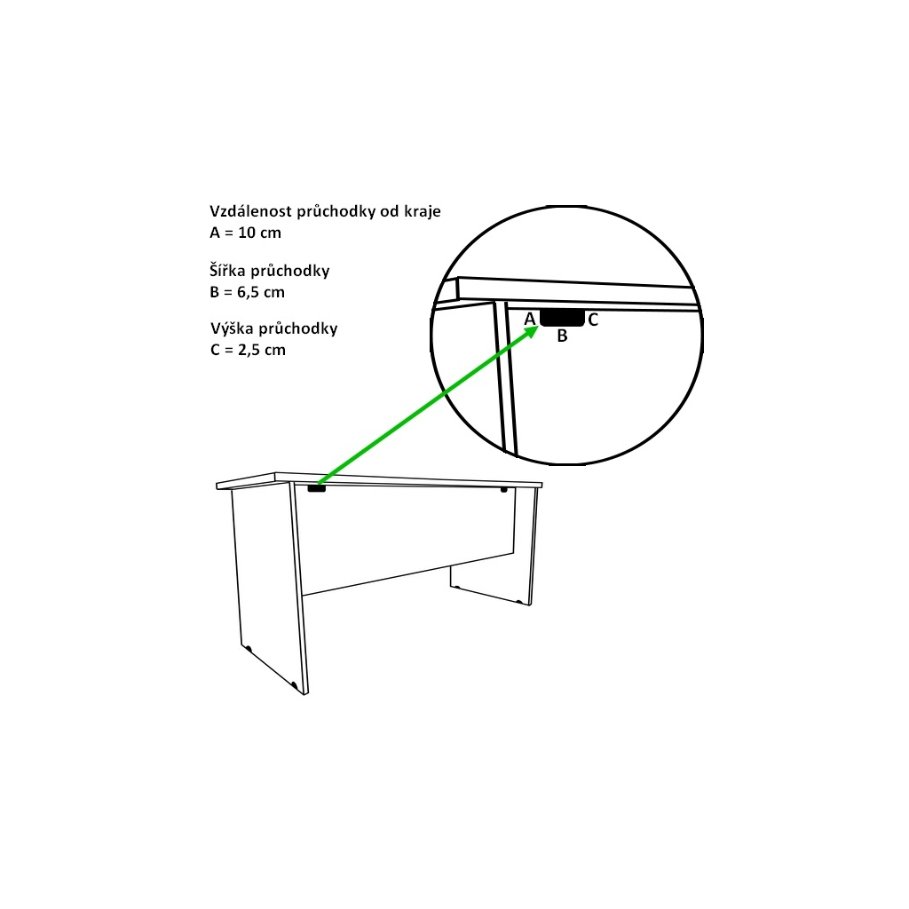 Vrchní deska je vyrobená z laminované dřevotřísky o síle 28 mm. Stůl disponuje mezi svou vrchní a čelní deskou praktickým otvorem, který poslouží pro vyvedení kabeláže.