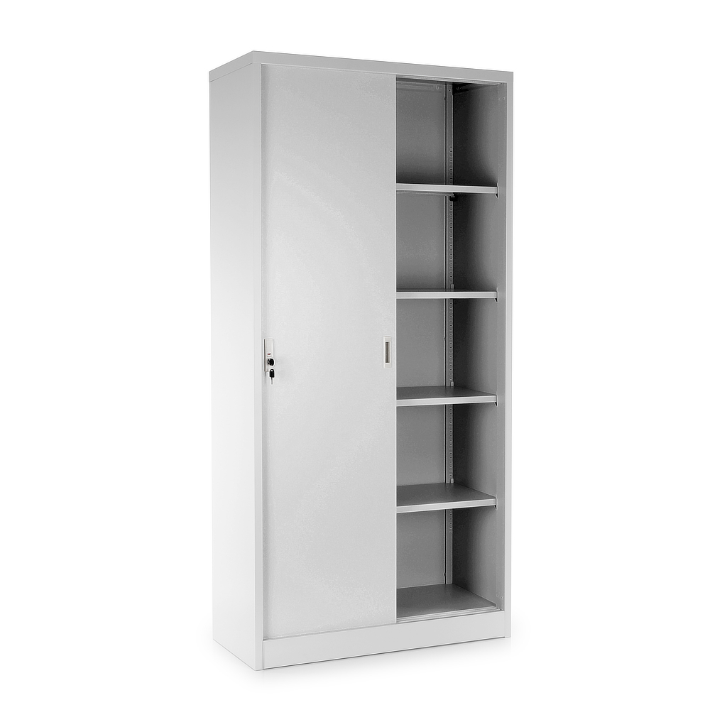 Univerzální kovová skříň s posuvnými dveřmi 90 x 40 x 185 cm, cylindrický zámek, šedá - ral 7035